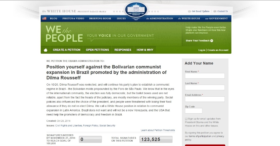 Após a reeleição da presidente Dilma Rousseff (PT), eleitores insatisfeitos com o resultado do pleito criaram uma petição (leia a íntegra abaixo) no site da Casa Branca pedindo que os Estados Unidos se posicionassem contra o que o texto chama de "expansão bolivariana e comunista no país" - até esta terça-feira mais de 123 mil pessoas tinham assinado o documento.