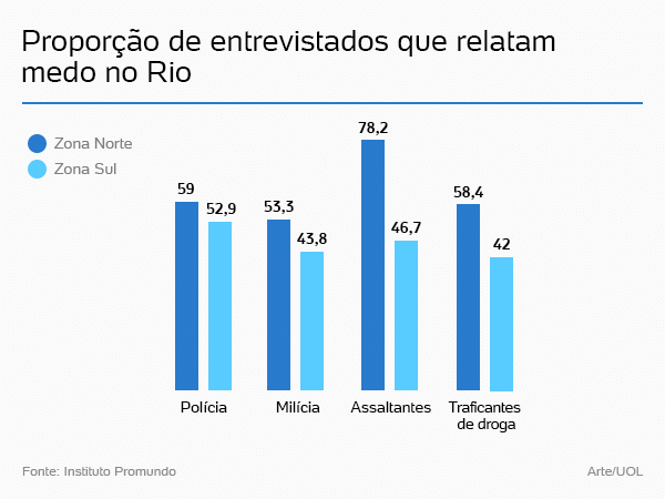A pesquisa dividiu os resultados pelas duas áreas. Na zona norte, 59% disseram ter medo da polícia, enquanto 52,9% dos entrevistados da zona sul relataram o mesmo medo. Os percentuais são maiores que os que apontam medo de traficantes nas duas áreas: 58,4% na zona norte e 42% na sul.
