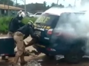 Em outro vídeo que circulou nas redes sociais e em grupos de WhatsApp, é possível ver o momento em que Santos é mantido preso no porta-malas da viatura da PRF por dois agentes da corporação.